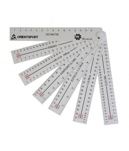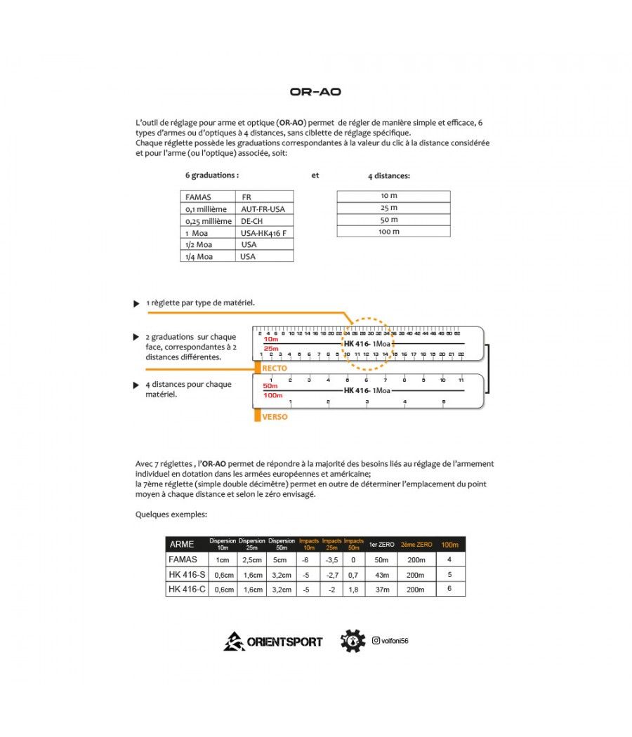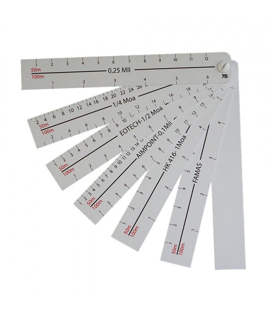 Réglette recto-verso par type d'arme ou d'optique (Famas, 0,1 millième, 0,25 millième, 1 Moa, 1/2 Moa et 1/4 Moa) à 4 distances (10, 25, 50 et 100 m) possédant les gradations correspondantes à la valeur du clic