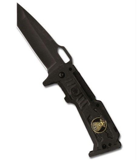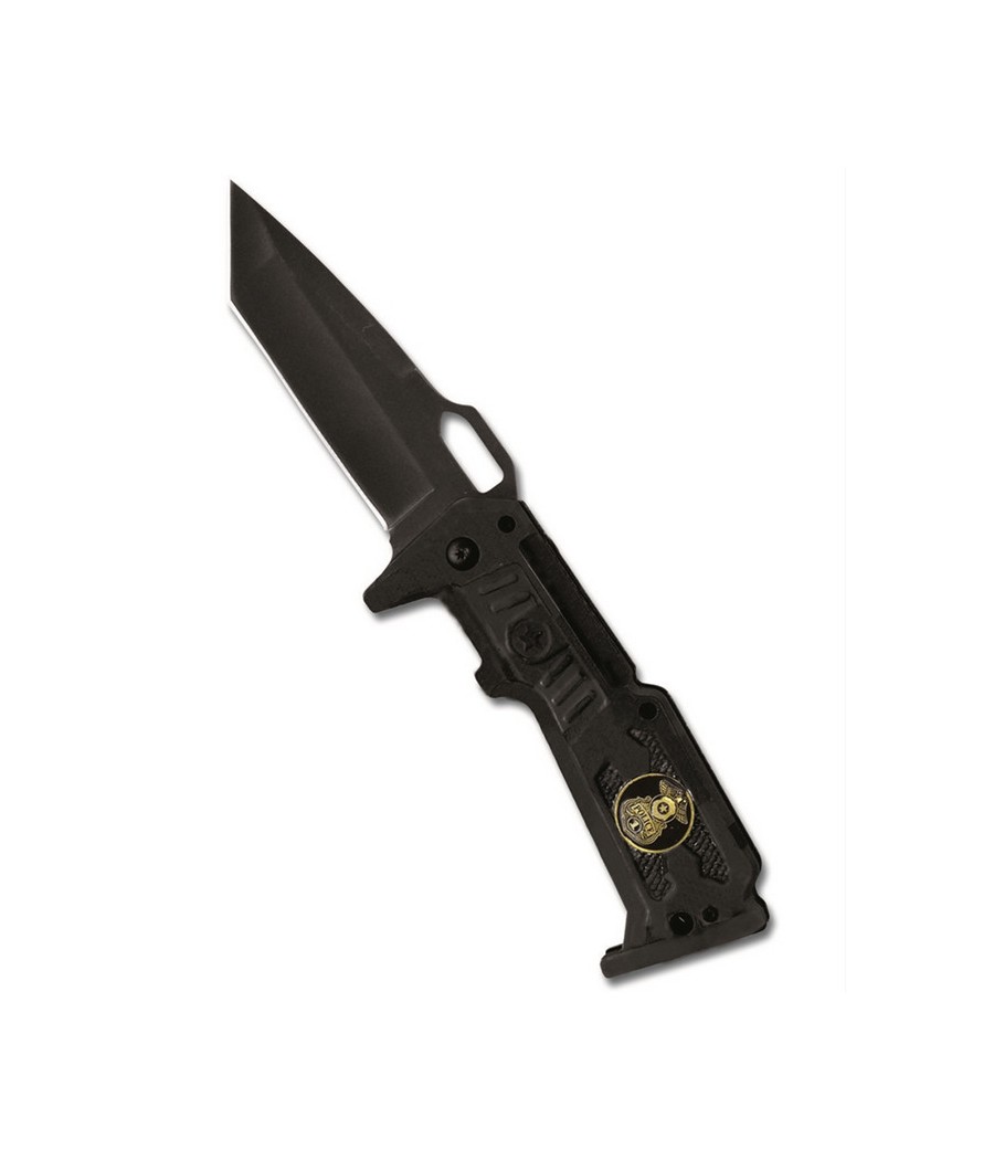Ce couteau tactique pliant noir, alliant élégance et robustesse, est équipé d'une lame lisse en acier pour une coupe nette et précise. Son manche en aluminium, à la fois léger et ultra-résistant, garantit une prise en main optimale. Orné de l'emblème de la police américaine, il incarne autorité et professionnalisme.