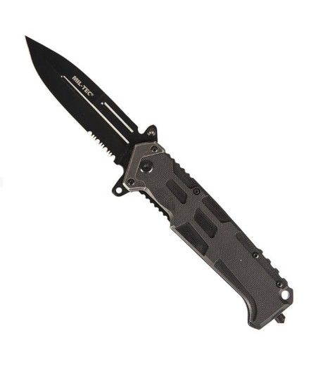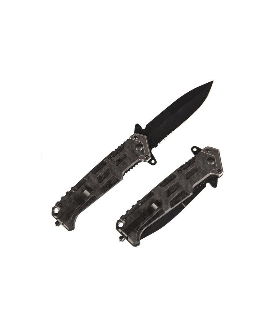 Le couteau pliant ASSAULT noir est conçu pour les missions exigeantes. Sa lame Spear Point en acier 440, à la fois lisse et crantée, offre une coupe précise et puissante. Le manche en plastique renforcé de fibre de verre assure une prise en main solide et une durabilité exceptionnelle.