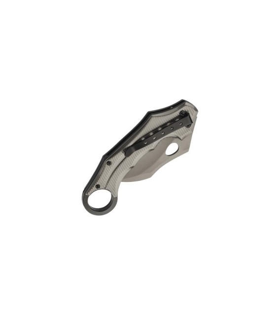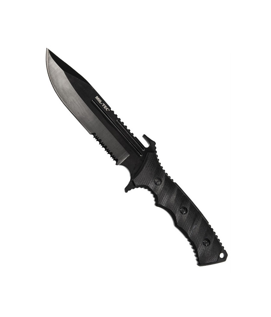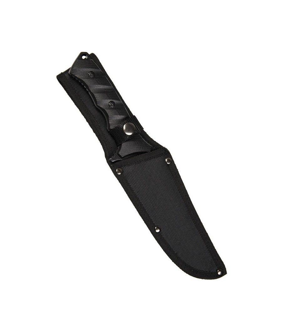 Le poignard G10 est équipé d’une lame Tanto noire avec un bord dentelé, offrant une coupe efficace et précise. Son manche ergonomique intègre un œillet pour lanière de sécurité et est vissé pour une solidité accrue.