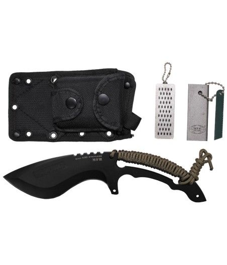 Le pare-main protège la main, et l’œillet en bout permet d’ajouter une dragonne. Le fourreau en nylon avec boutons-pression permet un port horizontal ou vertical, et la poche démontable offre un rangement supplémentaire. Le set inclut un aiguiseur et une pierre à feu pour un équipement complet.