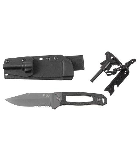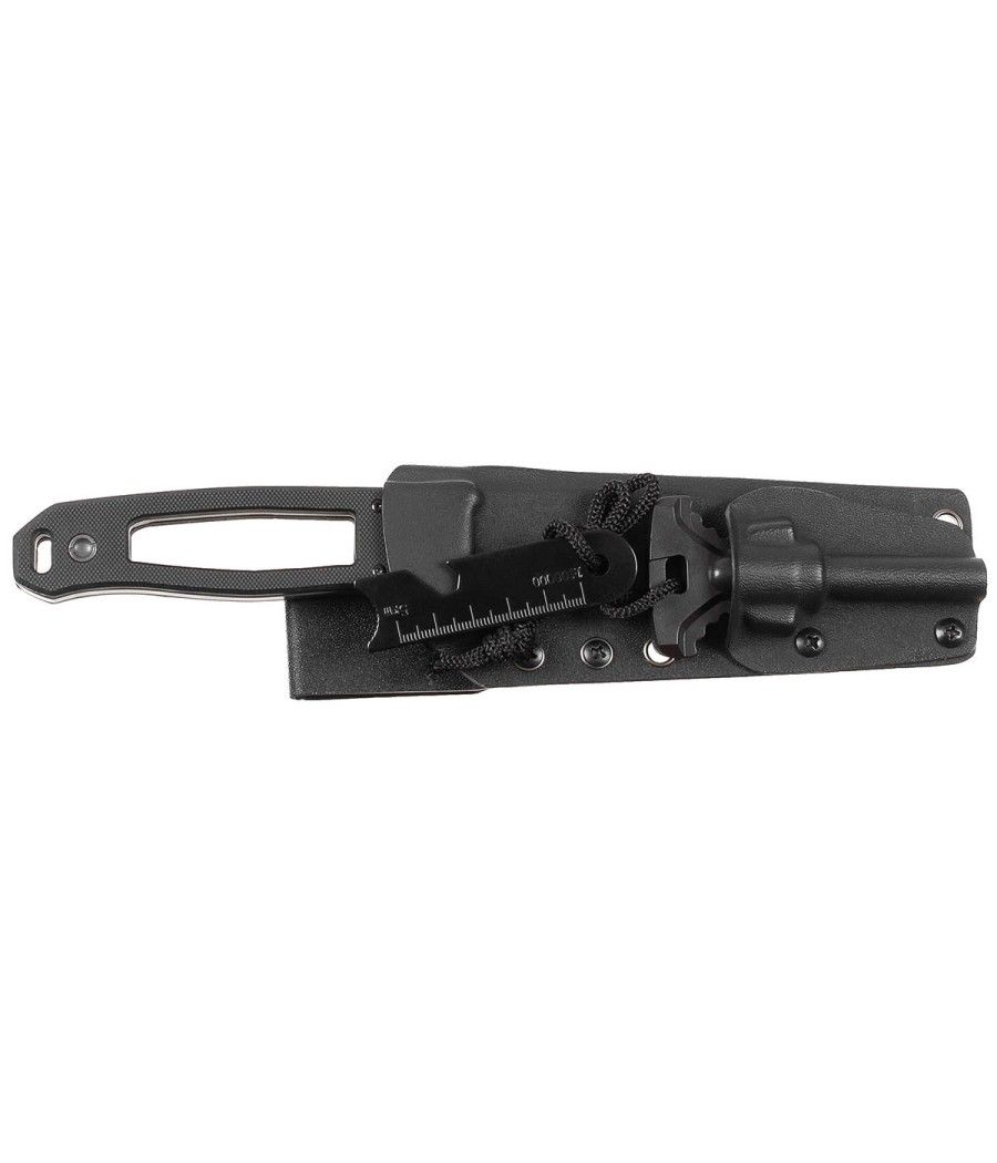 Le manche ajouré avec plaquettes en G10 et un œillet de fixation assure une prise en main ergonomique et sécurisée. L’étui en Kydex avec passant de ceinture garantit un port pratique.