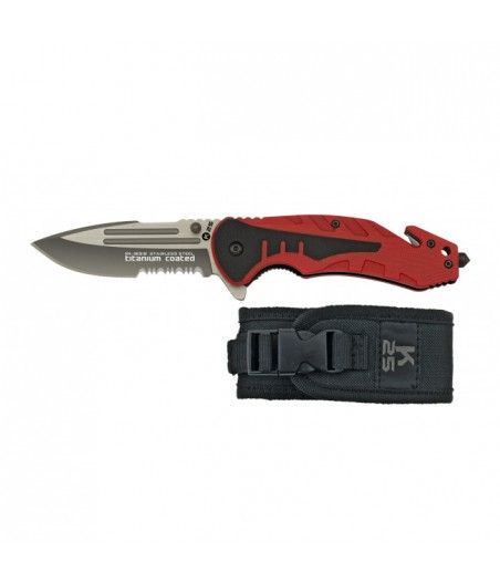 Le couteau K25 G10 de couleur rouge possède des accessoires. Il comprend un brise vitre, un coupe ceinture et un clip pour la ceinture.