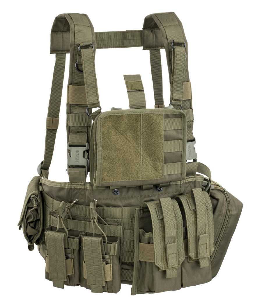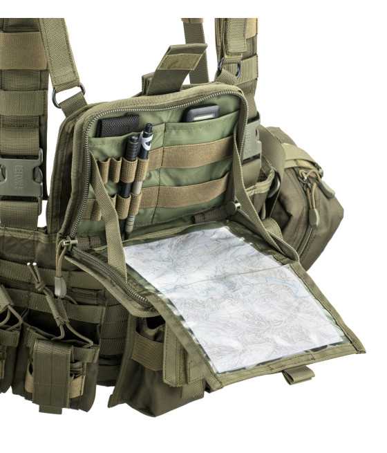 Le gilet de combat Multirole Recon de Defcon 5 est équipé de bretelles et d'une ceinture lombaire et peut transporter des plaque balistique frontale, thoracique et abdominale. Les plaques sont logées dans le compartiment spécial refermable.