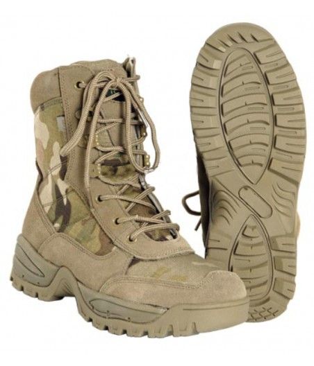 Les chaussures tactiques de coloris Multicam possèdent un zip pour facilité l'entrée du pied dans la chaussure.
