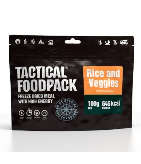 Un sachet de Tactical Foodpack de riz et légumes est un repas 100% naturel, sans conservateurs ni autres additifs. Juste un peu d'eau chaude ou froide et voilà, votre repas est prêt à être consommé. Ce sachet repas se conserve 8 ans après sa fabrication. Il a été testé et approuvè par les forces spéciales de nombreux pays.