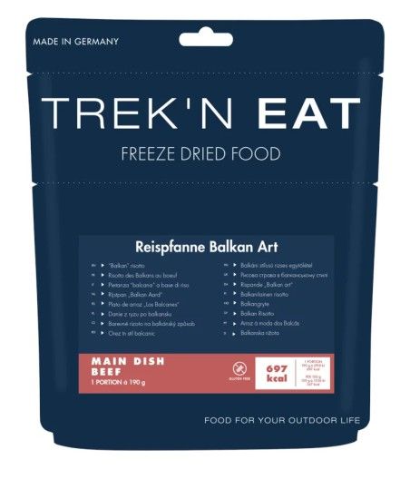 Le risotto des Balkans au bœuf Trek’n Eat est un repas lyophilisé complet et savoureux, inspiré des traditions culinaires d’Europe de l’Est. Ce plat associe riz, morceaux de bœuf et légumes pour un repas nourrissant lors de vos activités outdoor.