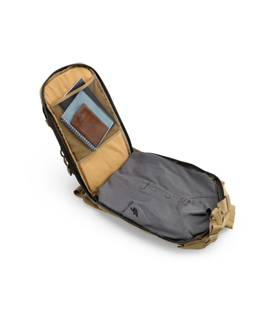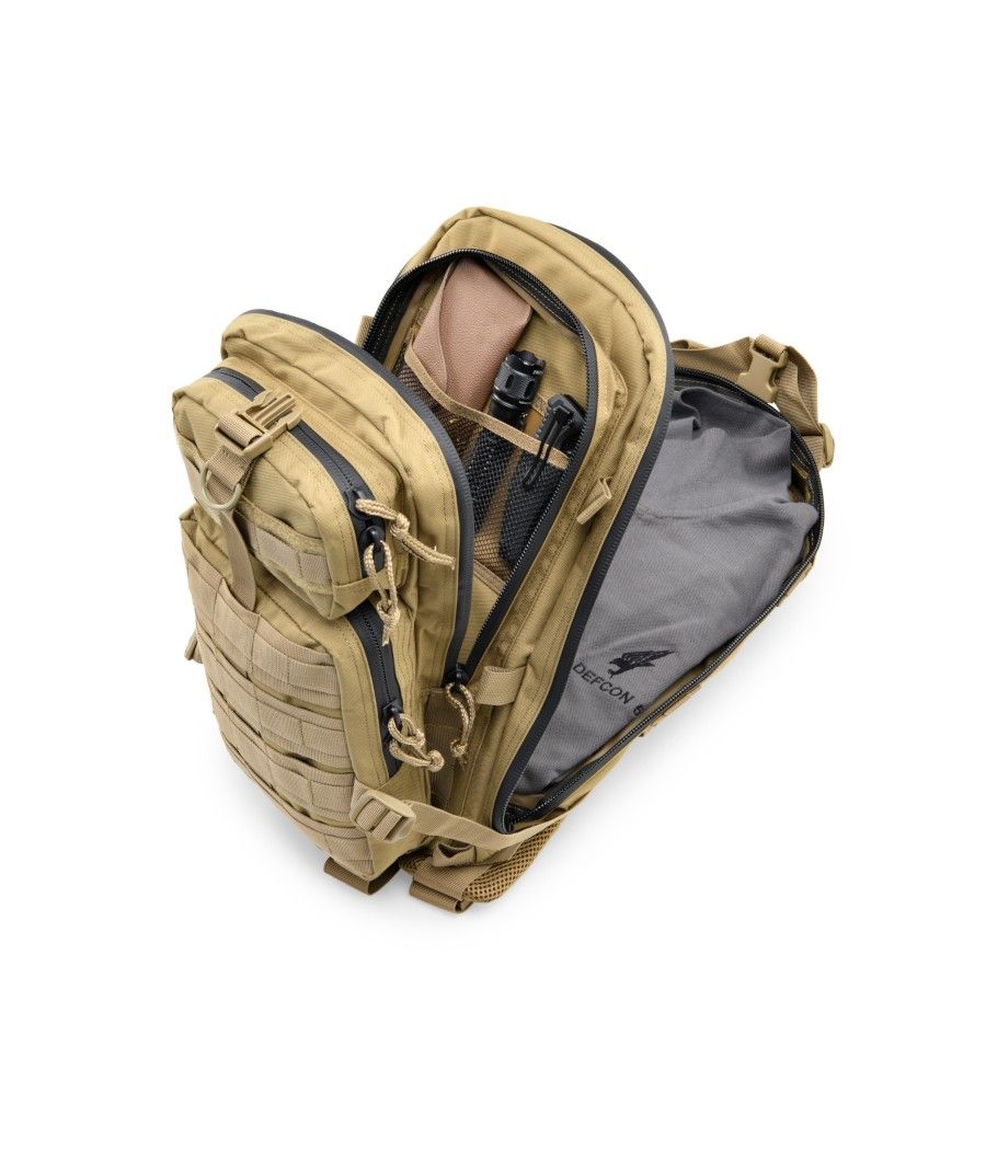 Le sac à dos tactical de Defcon 5 dispose d'un compartiment principal et d'un compartiment plus petit avec des poches intérieures adaptées pour mettre des documents, des cartes et tous types d'accessoires. Il est muni d'une poignée de secours sur le dessus et de trois ports pour les antennes, les combinès et le système de poche hydratation.