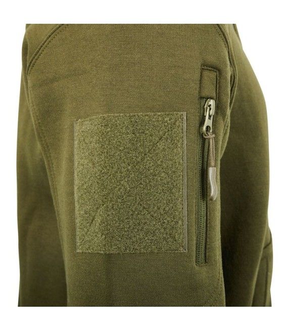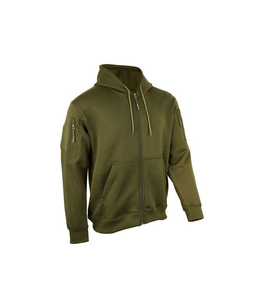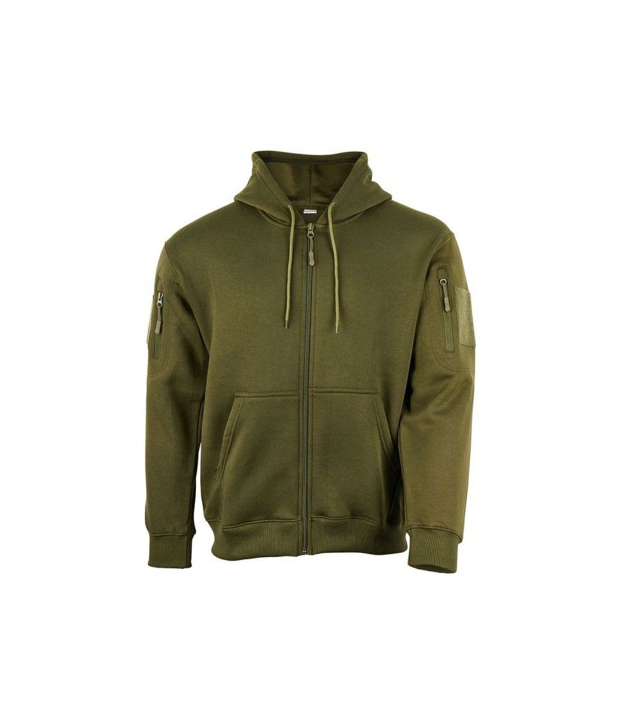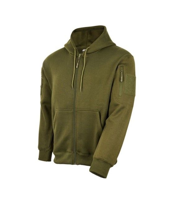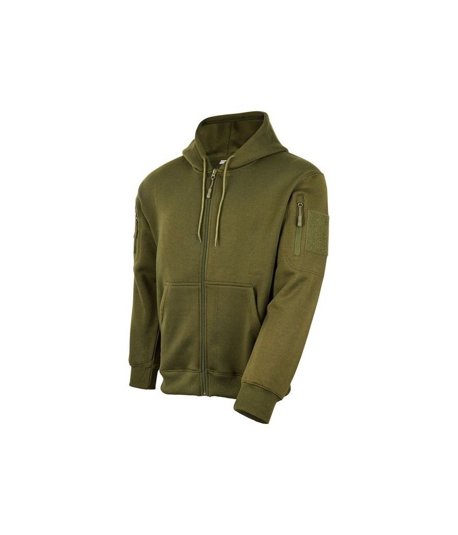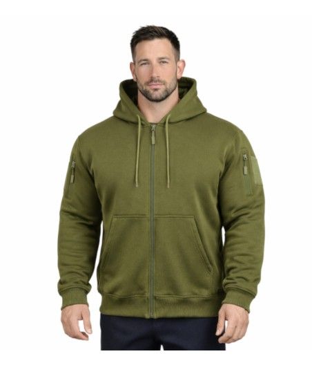 Ce sweat à capuche zippé kaki ARES, en polycoton 350 g/m², allie résistance et confort pour une protection optimale contre le froid. Polyvalent, il séduit par ses poches zippées et ses carrés auto-agrippants sur chaque manche, idéaux pour personnaliser avec vos écussons ou patchs.