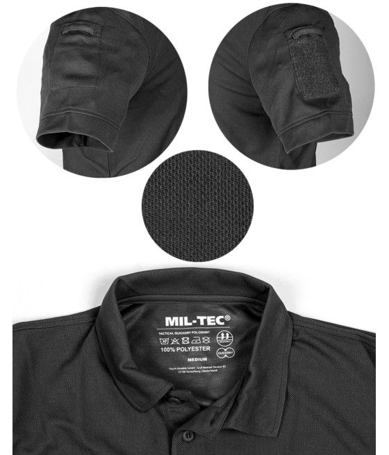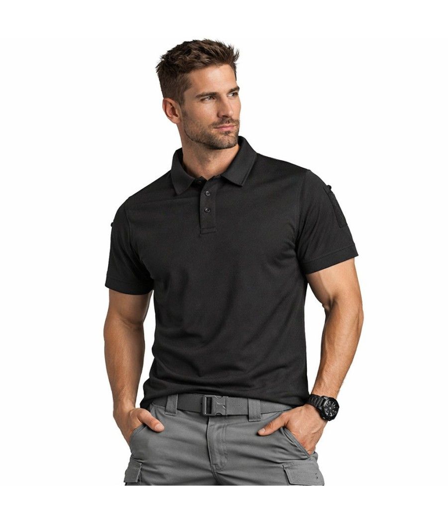 Ce polo tactique Quickdry noir, en tissu respirant, garantit une régulation optimale de la transpiration pour un confort inégalé. Équipé de bandes scratch sur les manches pour une fixation facile de patchs, il intègre également une petite pochette sur le bras avec bouton et des fentes latérales courtes dans l’ourlet, offrant mobilité et praticité.