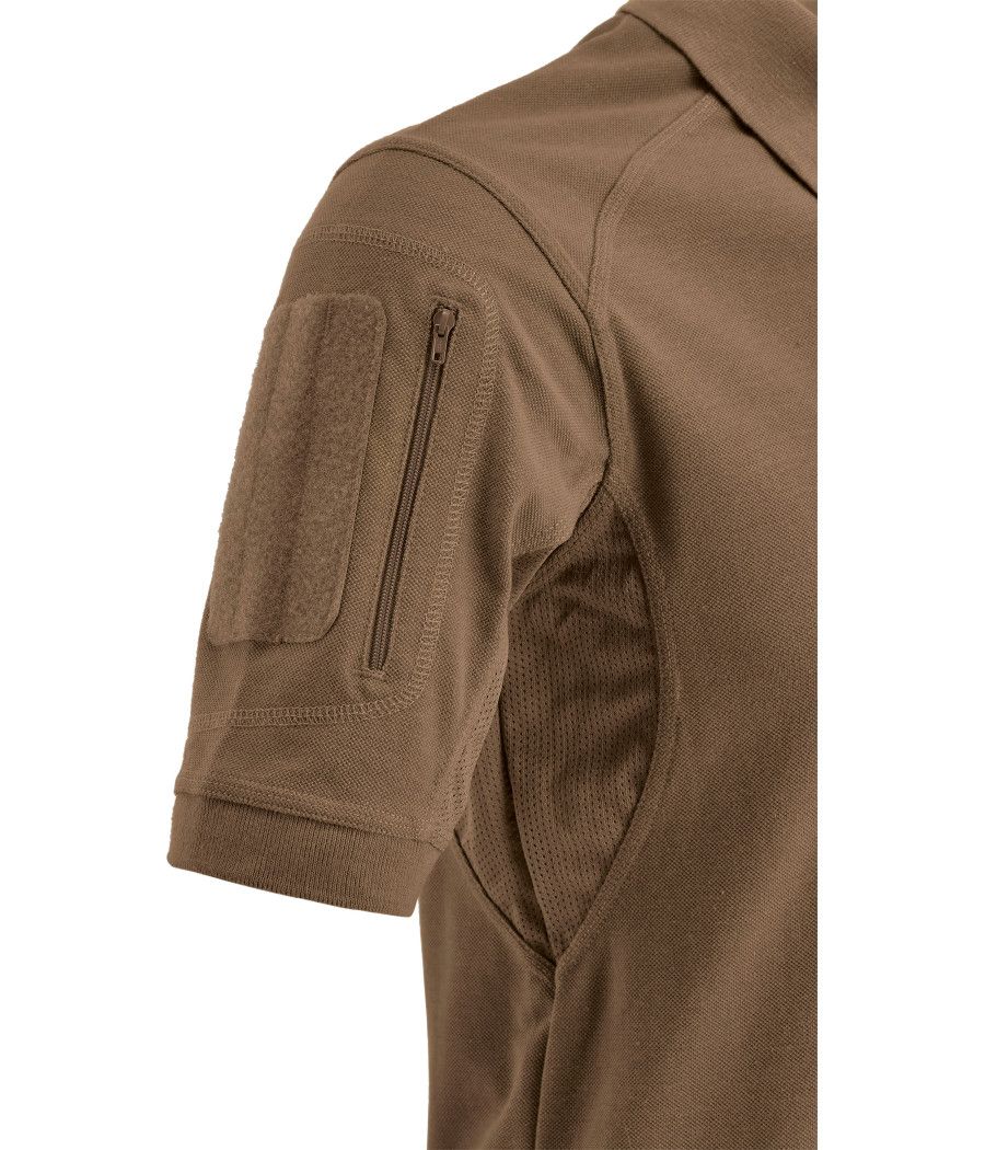 Le polo tactical kaki à manches courtes de Defcon 5 possède des petites poches sur les manches avec ouvertures zippées, velcro, inserts porte-stylos et mailles sous les bras.