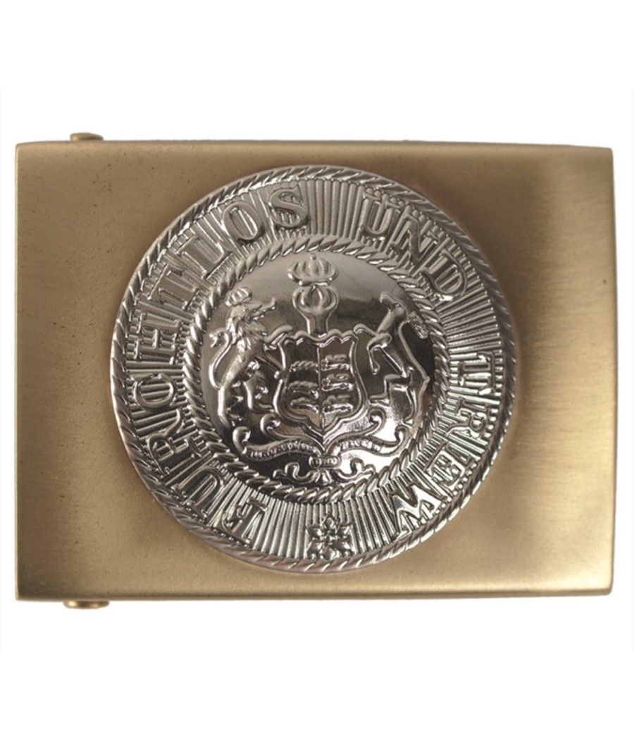 La boucle de ceinturon allemand or est une reproduction destinée à l'armée allemande durant la première guerre mondiale WW1. Ce ceinturon comporte la gravure "Furchtlos und trew" (Sans peur et courageux)