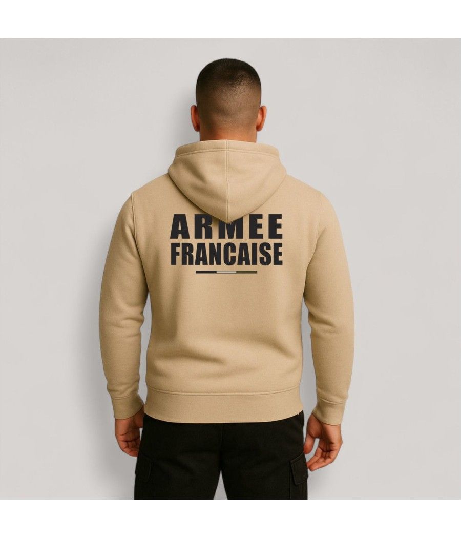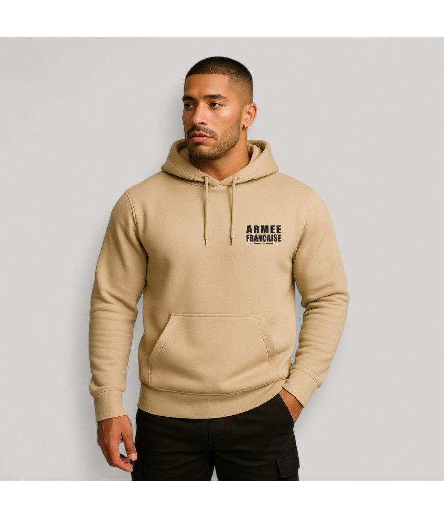 Découvrez notre sweat-shirt à capuche sable, orné d’une sérigraphie "Armée Française" et d’une bande tricolore en basse visibilité, pour un hommage subtil et élégant. Fabriqué en 100 % coton peigné 280 g/m², il allie douceur et résistance, avec un intérieur molleton gratté pour un confort optimal. Sa capuche intégrée et sa grande poche avant en font un vêtement à la fois pratique et intemporel.