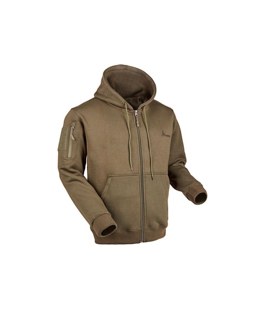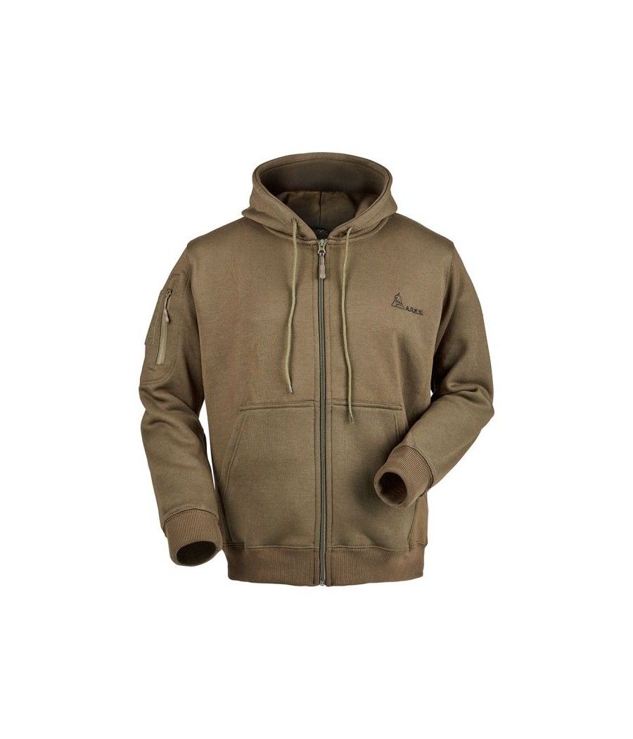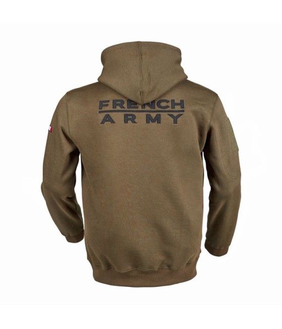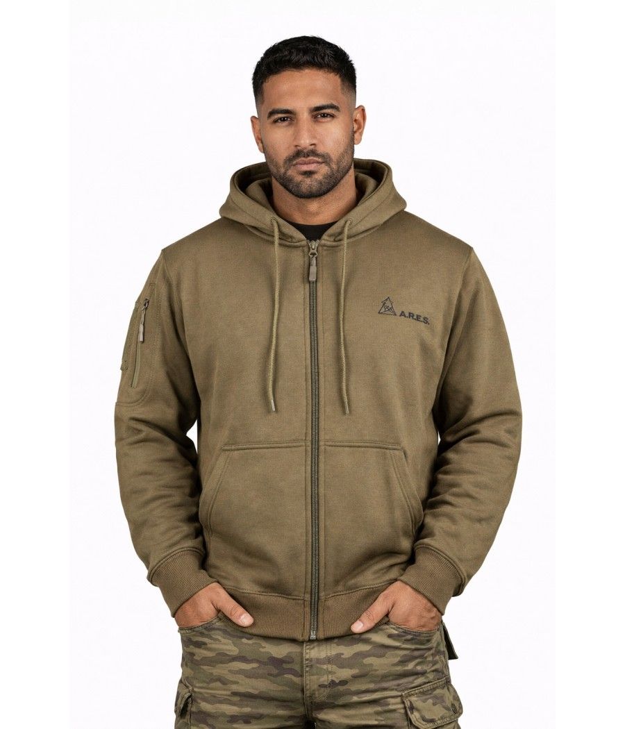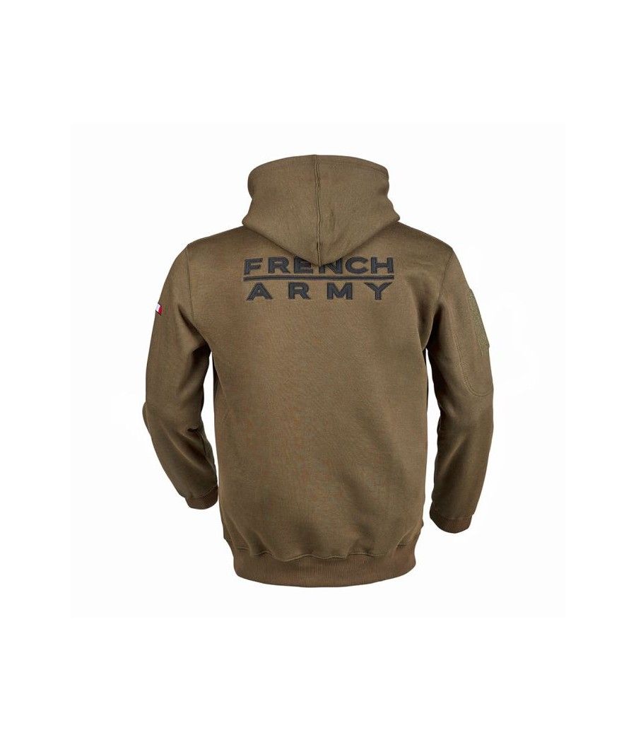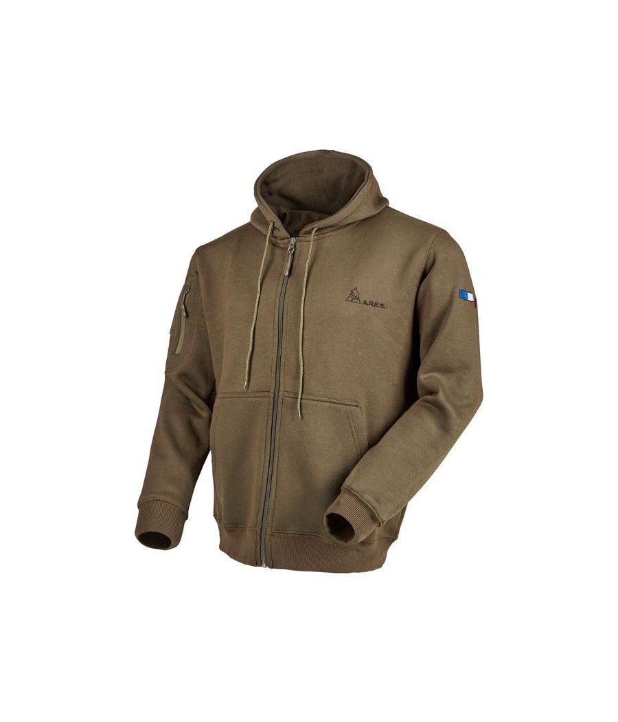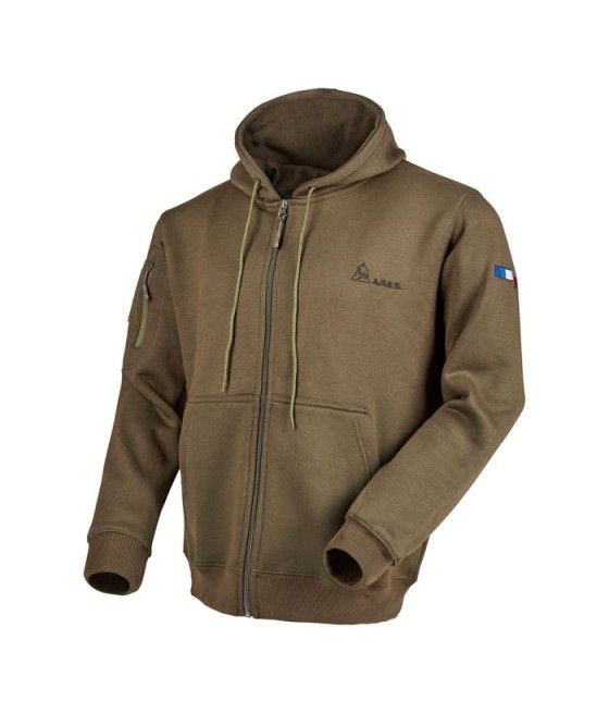 Ce sweat-shirt zippé coyote ARES en polycoton, avec capuche intégrée, allie confort et résistance. Brodé "FRENCH ARMY" au dos et marqué du drapeau français sur la manche gauche, il arbore le logo ARES sur la poitrine. Équipé d’une poche zippée et d’un carré auto-aggripant sur la manche droite, il permet une personnalisation facile avec écussons ou patchs.