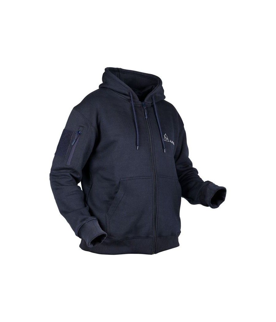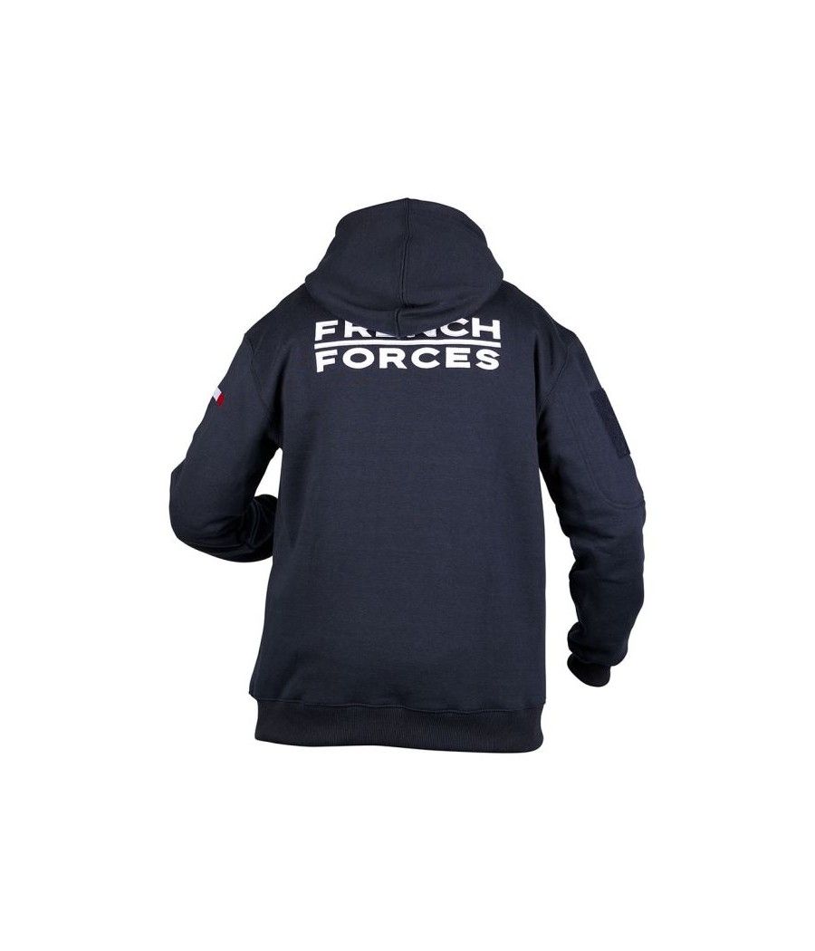 Ce sweat-shirt zippé marine ARES en polycoton, avec capuche intégrée, offre confort et durabilité. Brodé "FRENCH FORCES" au dos et orné du drapeau français sur la manche gauche, il affiche le logo ARES sur la poitrine. Grâce à sa poche zippée et son carré auto-aggripant sur la manche droite, il permet une personnalisation rapide avec écussons ou patchs.